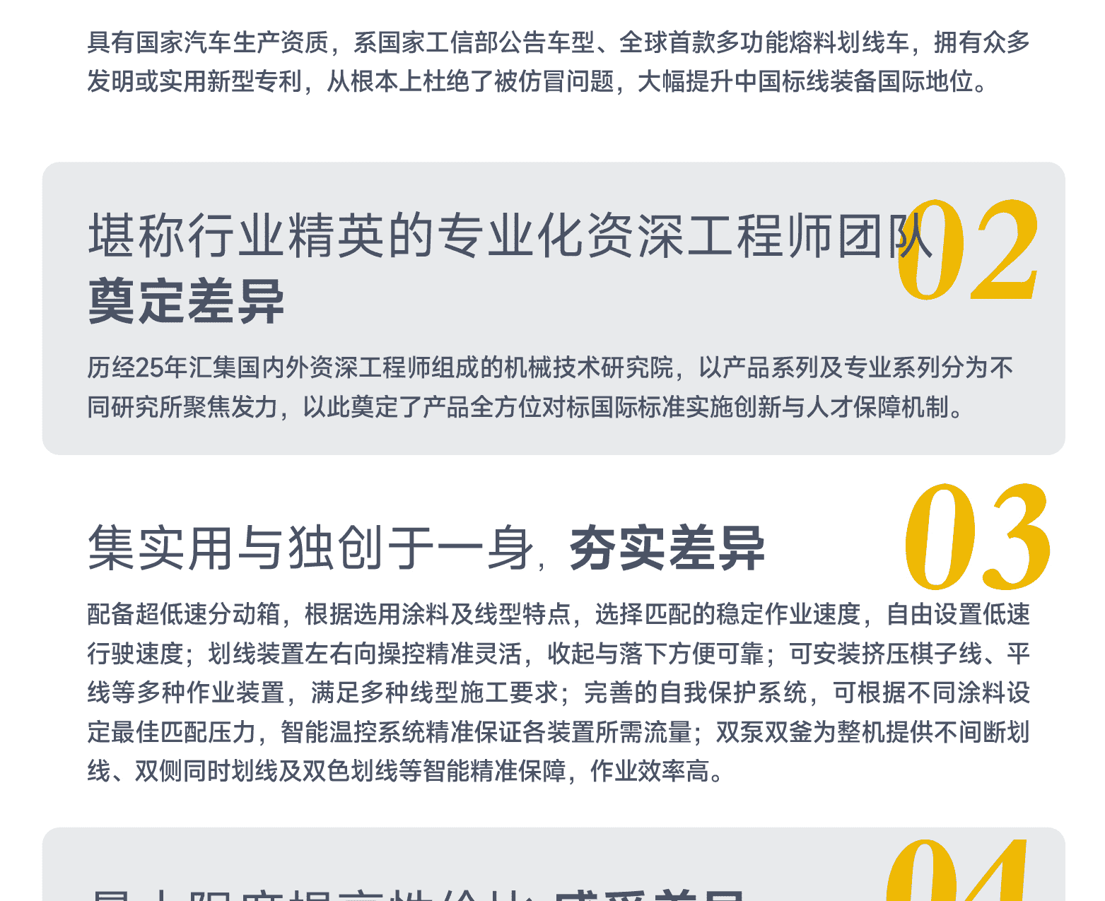 專利涂料泵(實用新型 2021229326550) 、高效加熱熔料系統(tǒng)、涂料加熱自動溫控系統(tǒng)、可視化智能操作平臺、進口液壓元件。主要特點:集成化程度高;可雙側劃線;性能卓越,經(jīng)濟高效,操控精準化